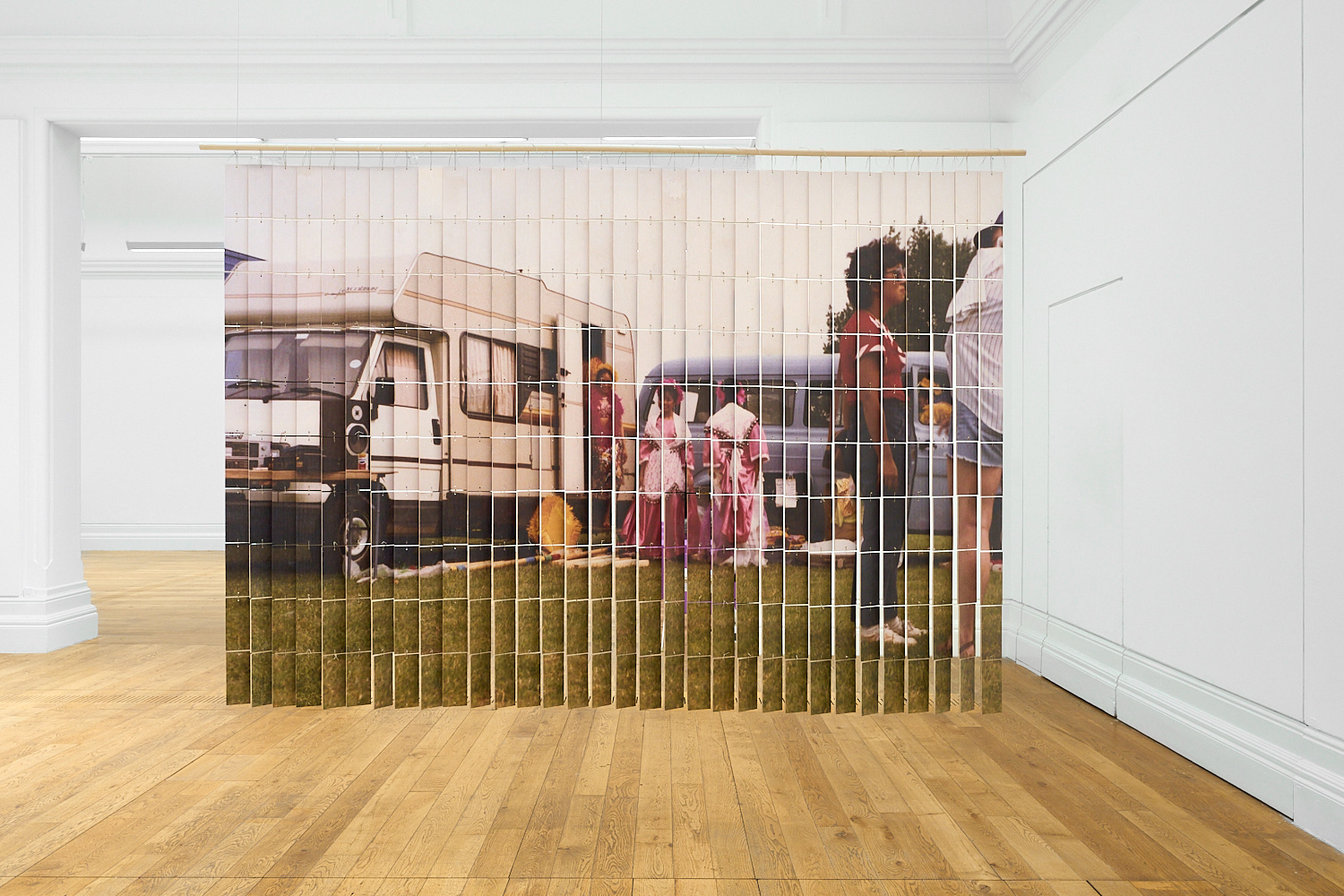Lei Aloha is an installation exploring the intersections of migration, cultural memory, and joy. Composed of two large beaded curtains, each made from 320 wooden tablets, the work features photographs of Lei Aloha, a London based Filipino and Hawaiian dance troupe active in the 1980s, of which the artist’s mother was a member. Captured on stage and behind the scenes at cultural events across the UK, including performances at the Royal Festival Hall, the images reflect moments of celebration, performance and solidarity among immigrant communities during a time of widespread hostility and systemic exclusion.